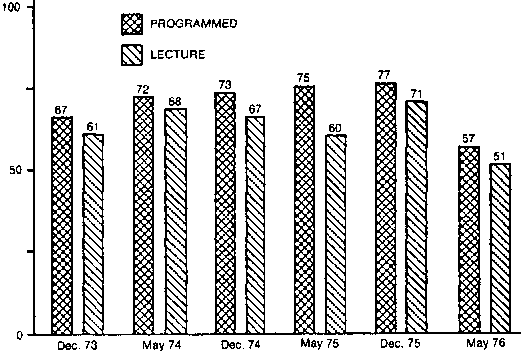 From 1973 to 1976 special effort was devoted to statistical analysis of the differences between ''Lecture" and "Programmed" classes. (During that time a two-semester "integrated" mechanics sequence was given to all engineering students.) The differences between the methods 3 are shown in figures 1 and 2 and tables 1 and 2. The statistical results strongly favor the programmed instruction. Students in the programmed sections not only have higher average scores, but also show less variability among individuals and among sections than students in lecture classes.