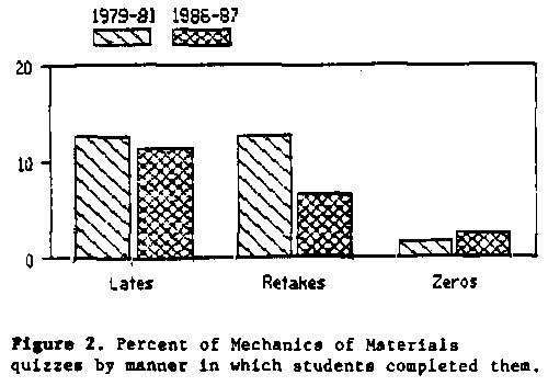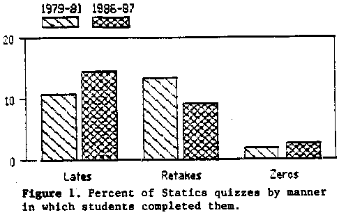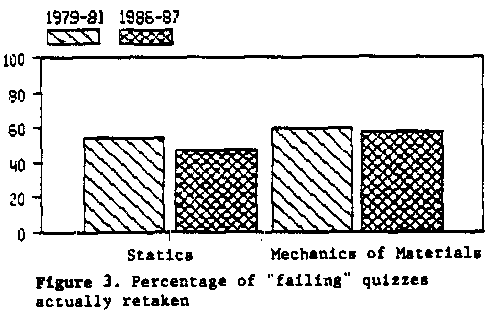Second, in both courses, students in 1986-87 retook a significantly lower number of quizzes. On further examination of the data, however, I observed that they had also received far fewer grades below 70 percent. On adjusting the retake rate for eligibility (students may not retake a score of over 70) it was found that there wee no difference. Figure 3 shows the differences in retake rate as a percentage of eligibility.