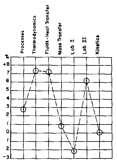 What about grades? Did an eight-week exposure to the programs have any effect on the students' grades? Yes, the program class scored 7% above the control class on the first examination. However, subsequent examinations for non-program areas of the course produced equally great differences, so no great case for programmed instruction can be built on this score. What about grades in subsequent chemical engineering courses? Did eight weeks of work with programmed instruction have any effect on the students' performance after they were mixed with the control class in the regular course sequence? The data are shown in Figure 1, where the performance of the program class in each subsequent chemical engineering course is compared to the performance of the control class. The average grade of the students from the program class is higher than that of the control class in all courses except Laboratory I. The greatest difference occurred in thermodynamics, where the program students scored an average of over 7% higher than the control students. However, this difference is at least in part due to the fact that the students who used the program have a cumulative grade index that is approximately 1% higher than the control students. A dotted line shows the expected level of performance of the program class at this 1 % level.