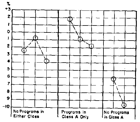 In this experiment, both classes used a program as a supplement to the regular material for the first section of the course; only one class used the second program; the other class used the third program; etc. Neither class had a program for the final section of material. Both classes took the same examinations in a special evening period.