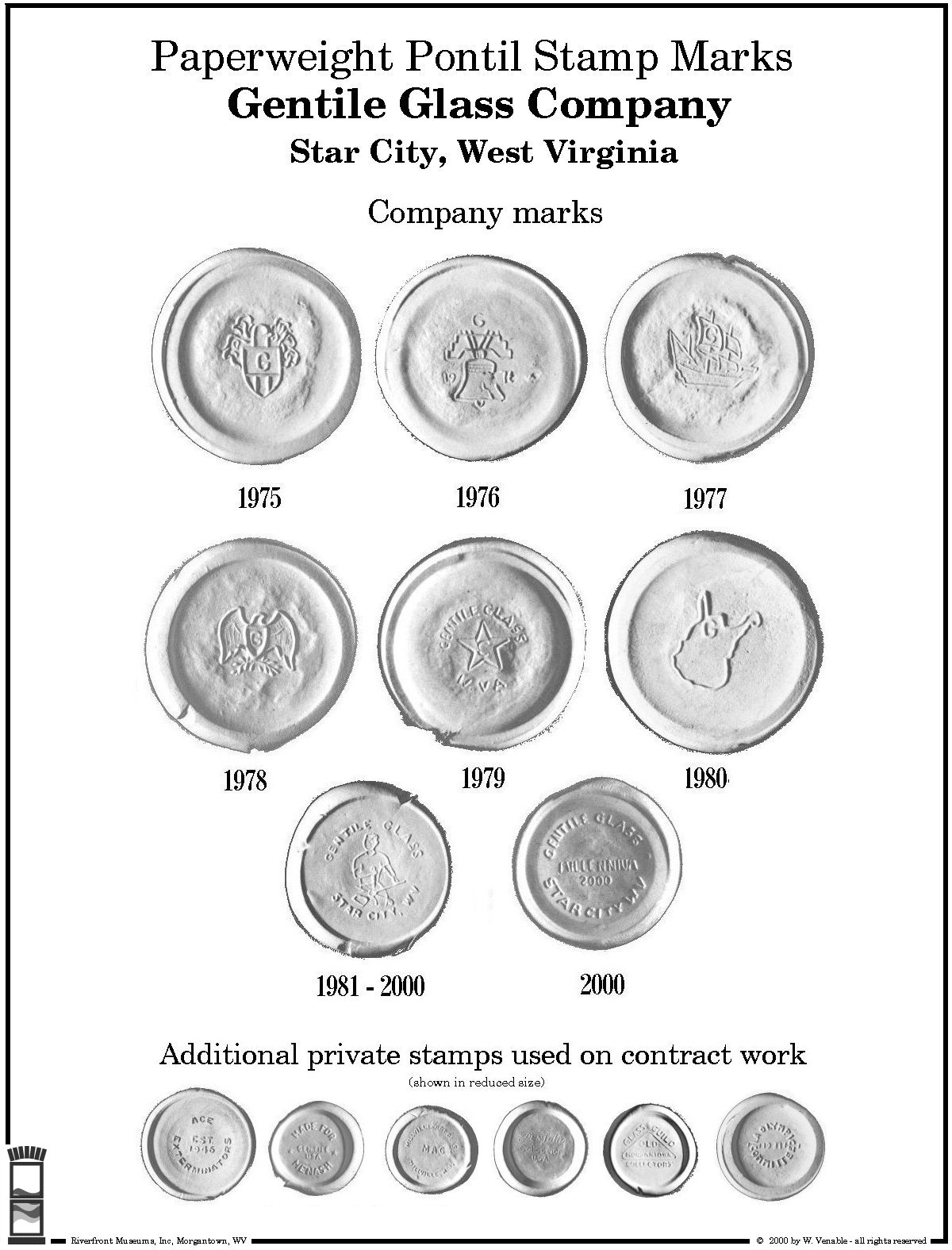 Another short project which I did while RMI was operating was to create a page of the various stamps used on the bottoms of paperweights produced at Gentile Glass Company in Star City - a Morgantown suburb. Not shown is a blank stamp used on the lowest cost weights. After the weight was broken off the punty, the base was headed with a torch and then the weight was placed in a modified drill press and the impression was made.
